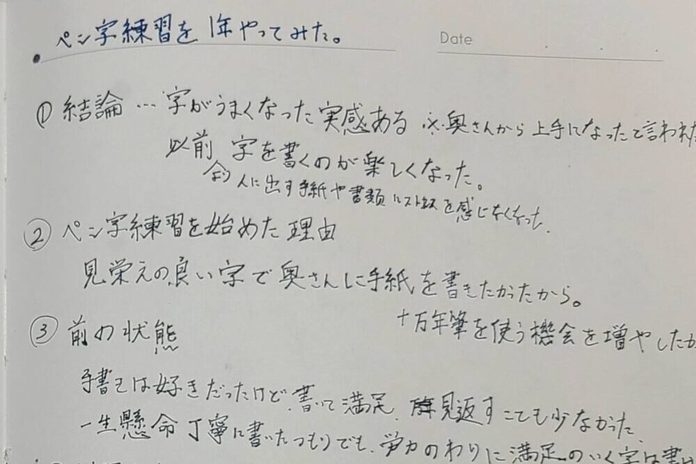奥さんから具体的に「字が上手になったね」と褒めてもらえたので、それを励みにペン習字を続けられました。